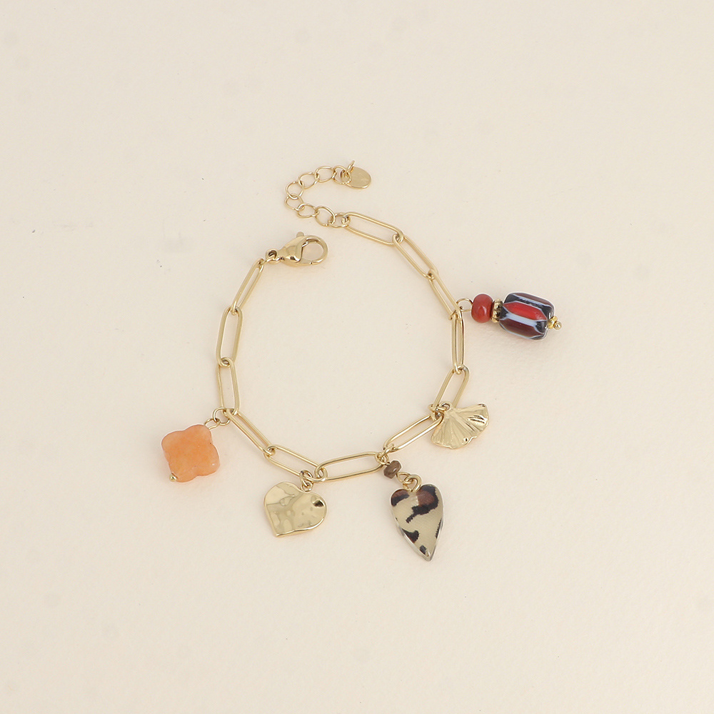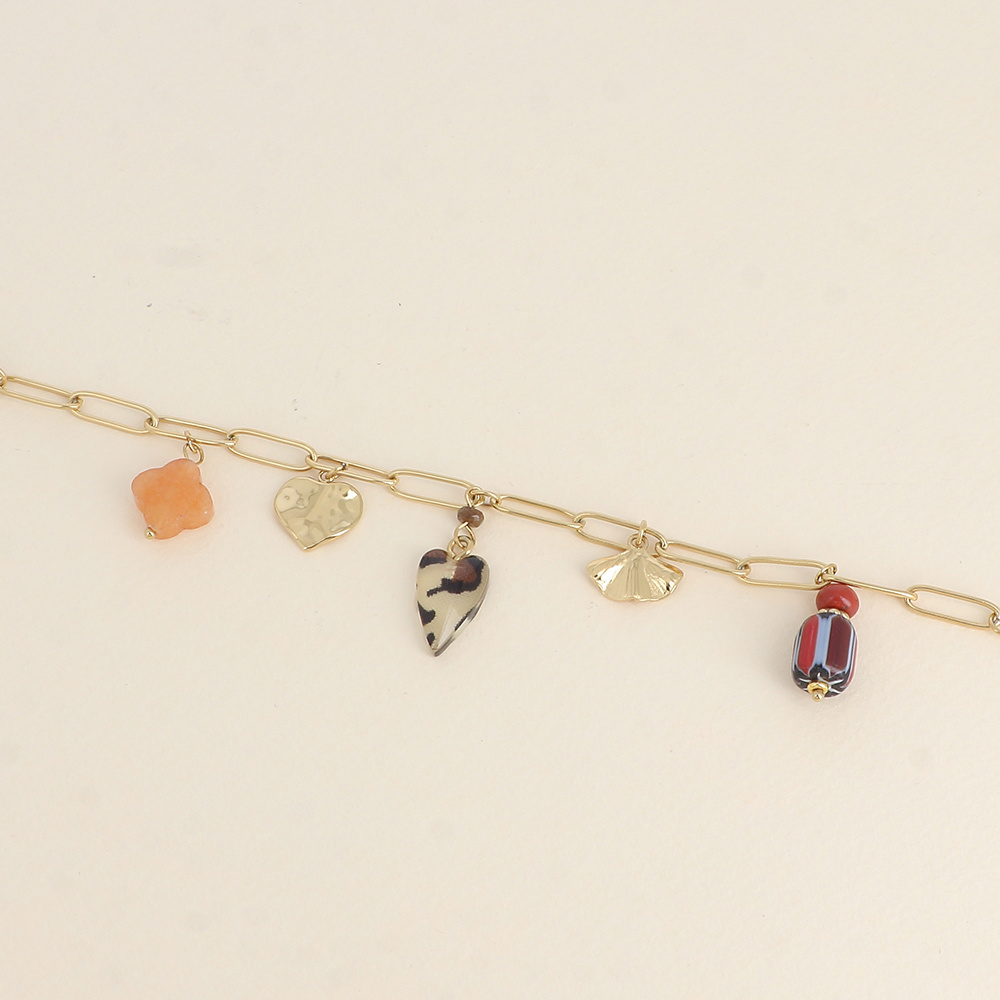 Stainless steel chain with various pendants (hearts, leopard resin, natural stone clover, ginkgo, and pearls).Chain length: 40 cm.Adjustable chain length: 5 cm.Chain length: 45 cm.