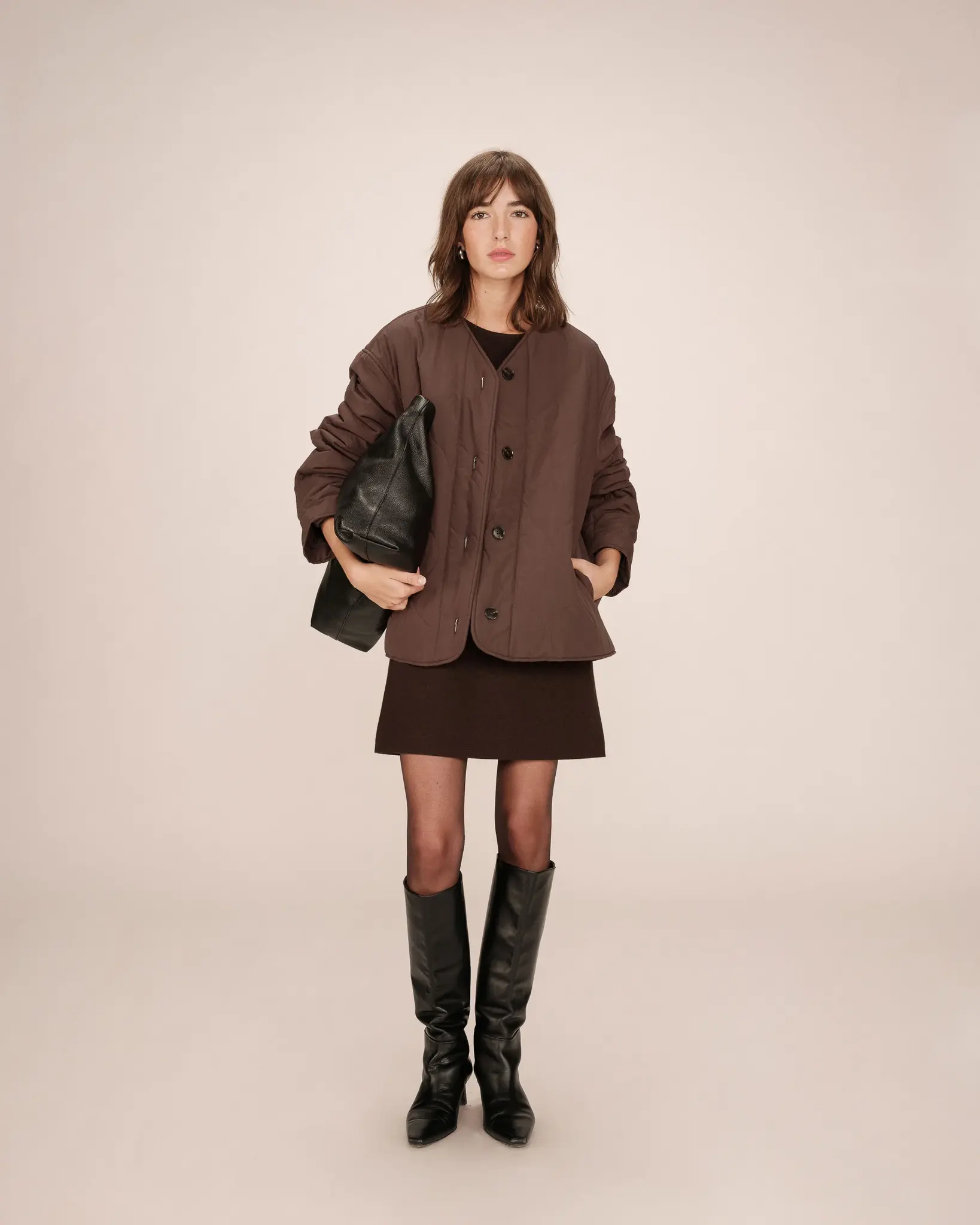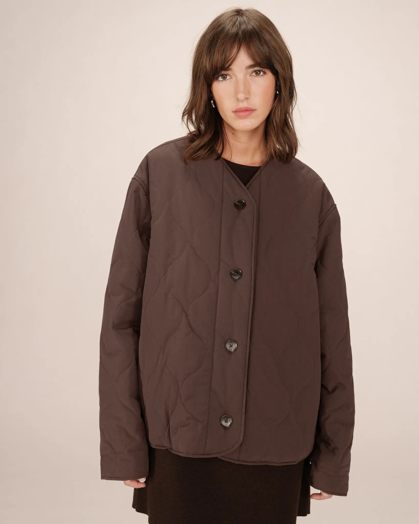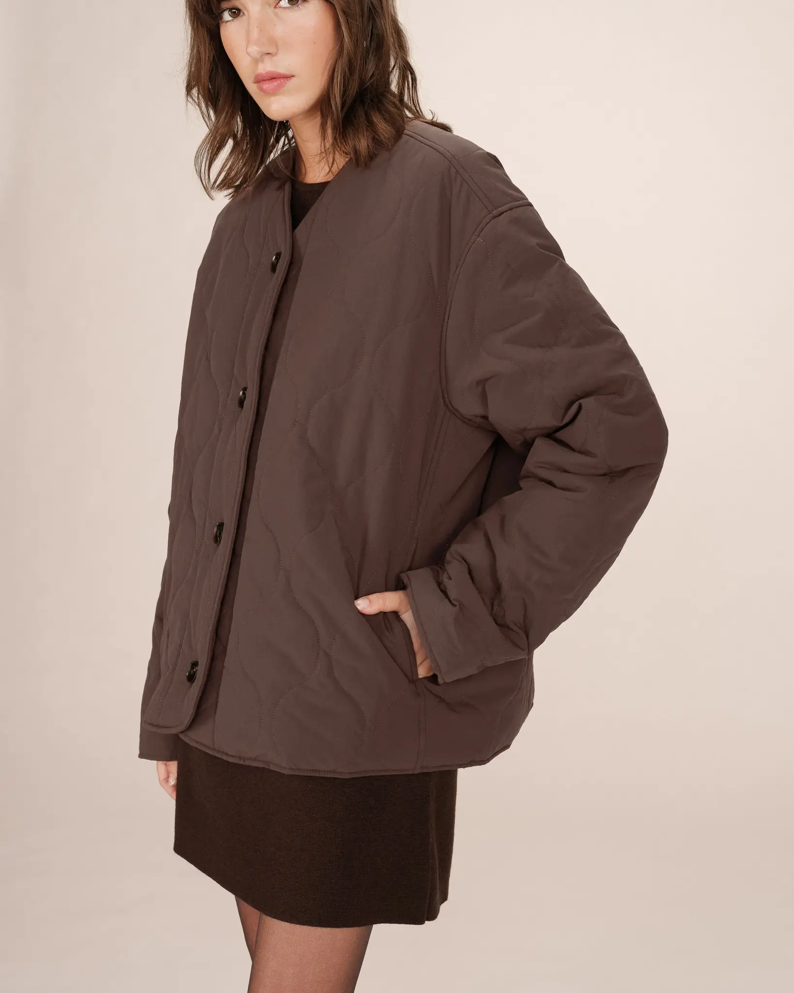 The SHANIA quilted down jacket is a comfortable piece that creates a relaxed silhouette. Lined and with long sleeves, the SHANIA quilted jacket is a winter wardrobe essential. The model features a V-neckline, a button placket at the front, and pockets at the sides. The SHANIA long-sleeve down jacket is enhanced by engraved \'GM\' buttons.