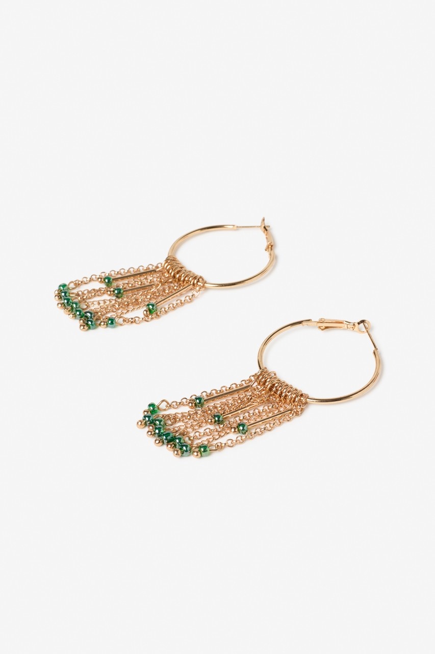 Creool oorbellen met hangende kettingen en kralen.