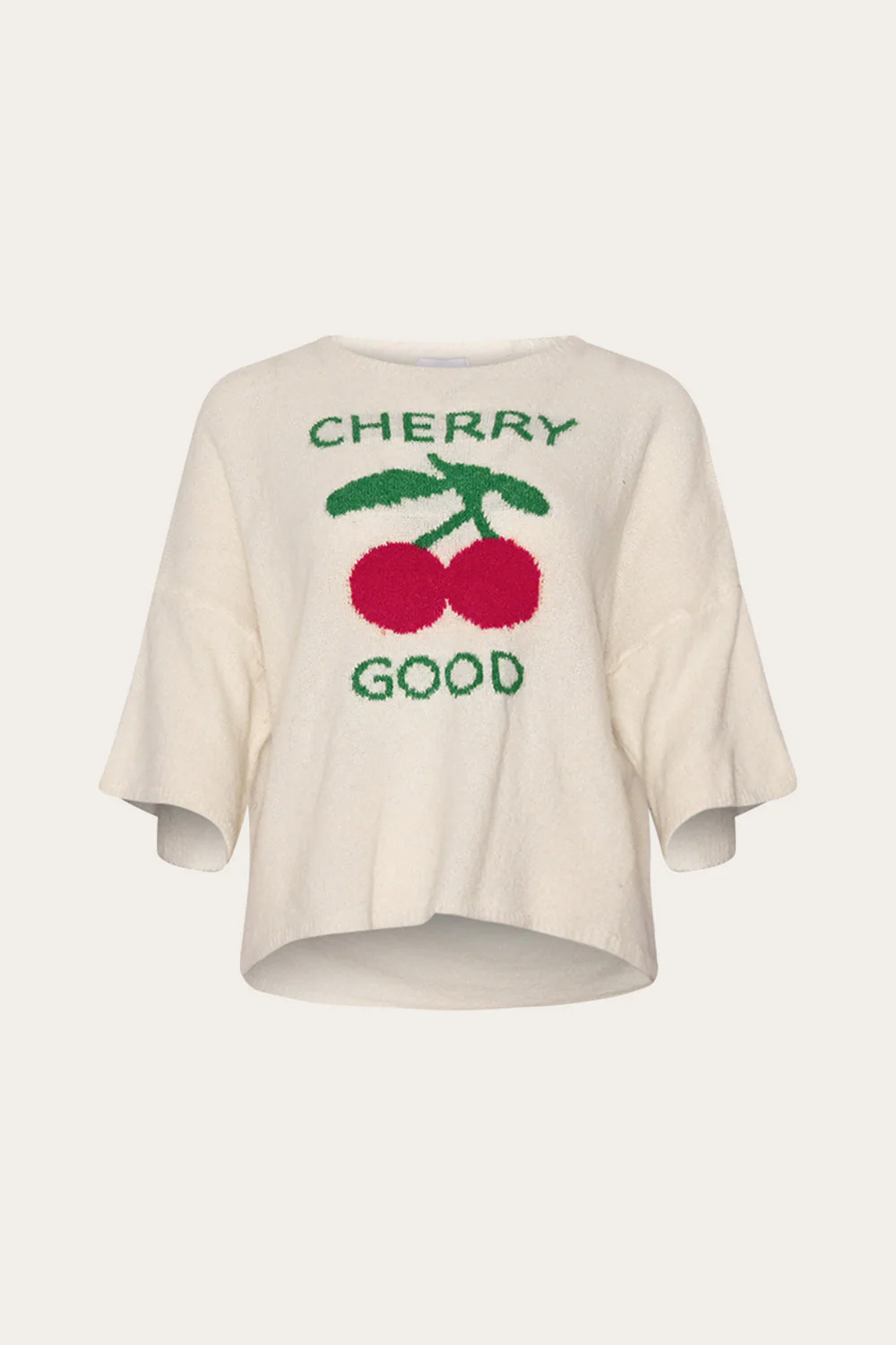 Gebreide trui met korte mouwen, kersen en tekstPasvorm: Classic/Regular FitGeproduceerd in: 62% acryl, 12% wol, 13% polyester, 11% nylon, 3% spandexPasvorm: Valt normaal