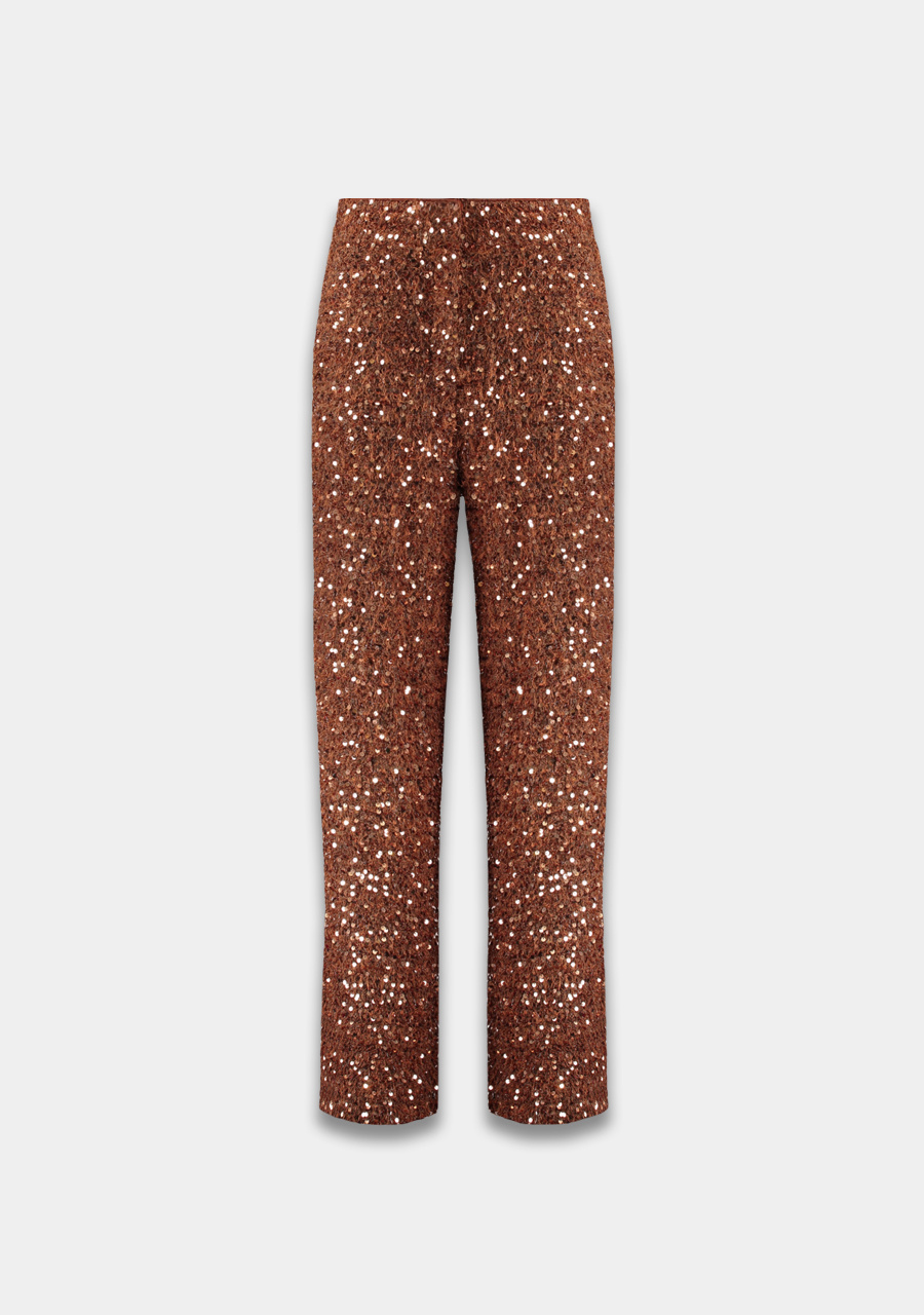 Ready to steal the spotlight. De HOLLY pants in Bronze Sequin is gemaakt om op te vallen. De glinsterende pailletten geven een feestelijke en luxueuze uitstraling, perfect voor de party season. Dankzij de elastische tailleband zit de broek comfortabel en beweegt ze soepel met je mee. De rechte fit zorgt voor een elegante look met een moderne twist. Combineer met de bijpassende SANNY polo voor de ultieme co-ord set.