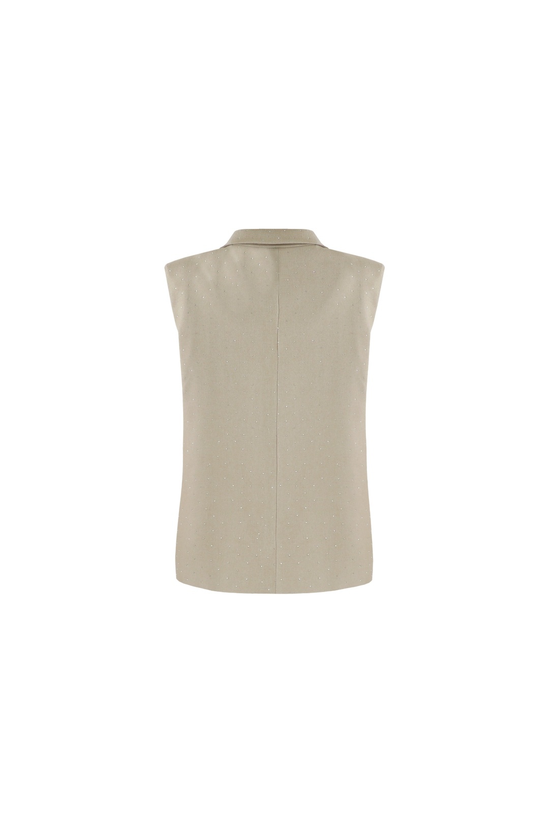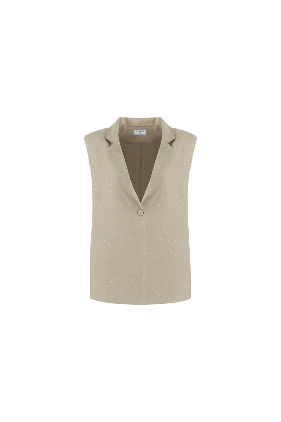 Say hello to sparkle! De JOELLE GILET is een classy gilet met een speelse twist dankzij de subtiele glans in de stof. Het mouwloze design en de nette kraag zorgen voor een krachtige look. Combineer met de YELENA SHORTS voor een coole two-piece met flair.