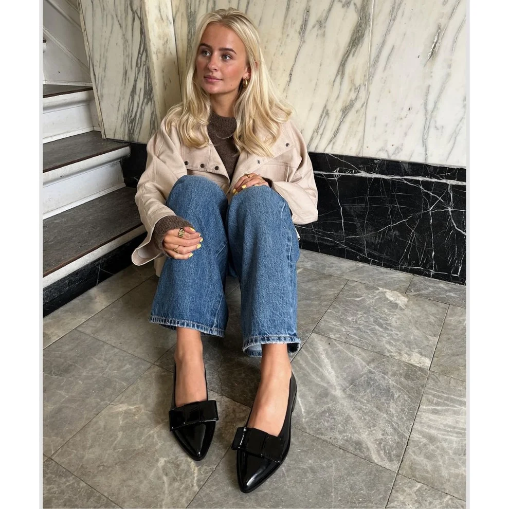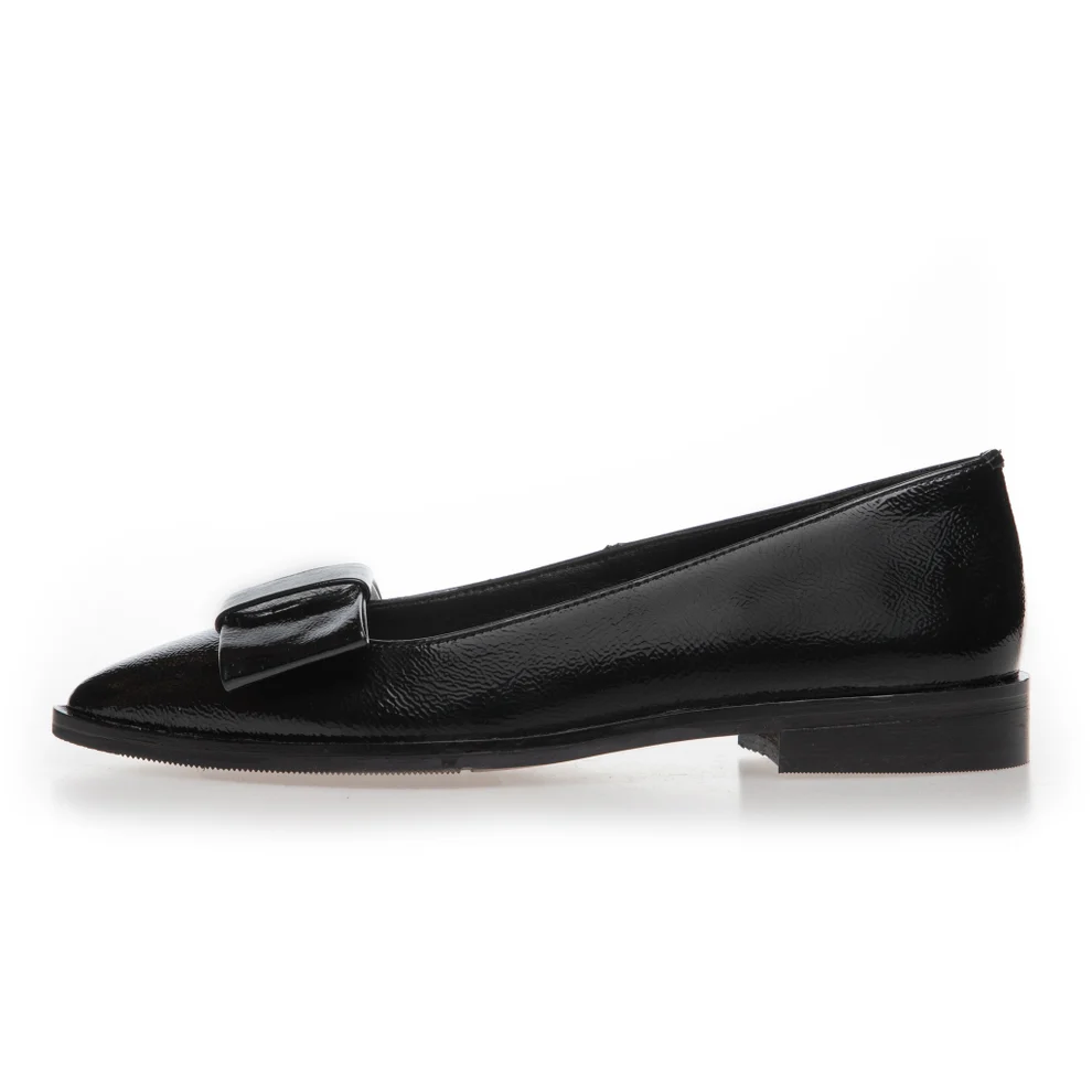 Elegante ballerina in zwart lakleer met puntige neus en een mooie, eenvoudige strikdetail. Het glanzende leer geeft het model een klassieke en vrouwelijke uitstraling die geschikt is voor zowel alledaagse als feestelijke gelegenheden.