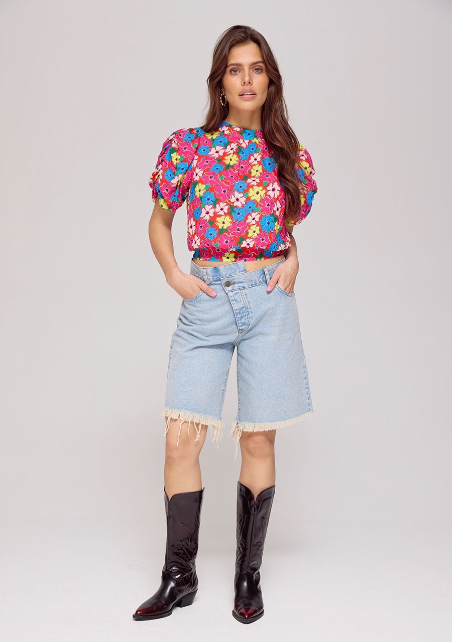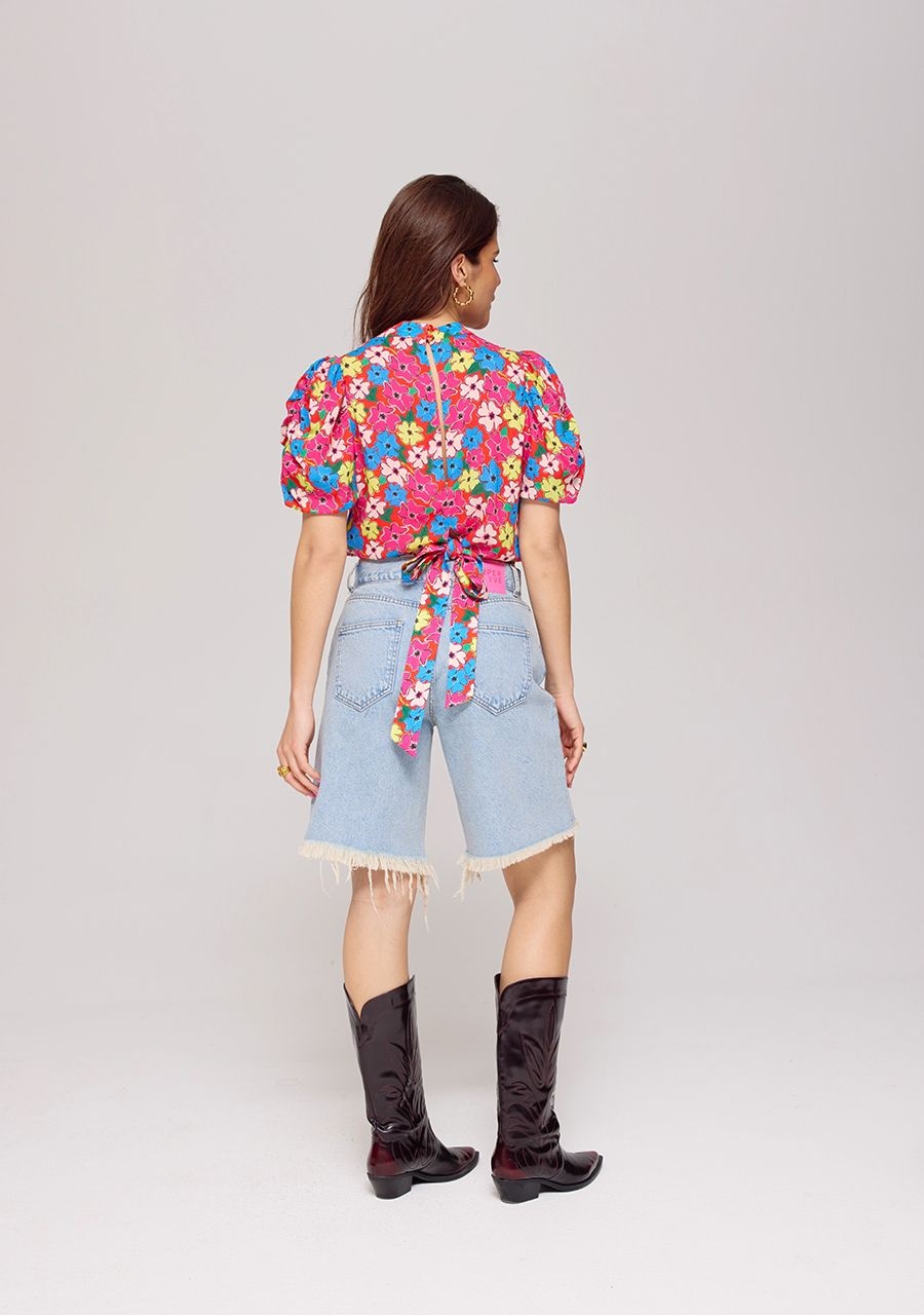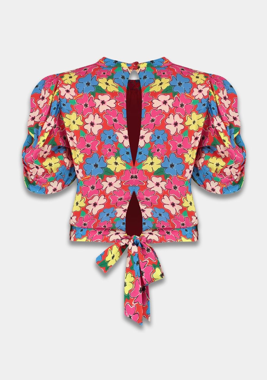 Say hello to colour wirh the MACEY blouse. Een echte eyecatcher voor jouw zomerlook! Deze blouse barst van de vrolijke bloemenprint in felle kleuren die je instant een zonnig gevoel geven. De pofmouwen geven het geheel een vrouwelijke touch en de hoge hals zorgt voor een elegante balans. De achterkant is verrassend open met een speelse knoopsluiting en een strikceintuur in de taille die je silhouet mooi accentueert. De zachte stof draagt heerlijk luchtig, ideaal voor zonnige dagen. Combineer m met de bijpassende RUBY skirt voor een complete, kleurrijke set of draag m casual op een jeansshort. Youll love how this piece instantly boosts your outfit.