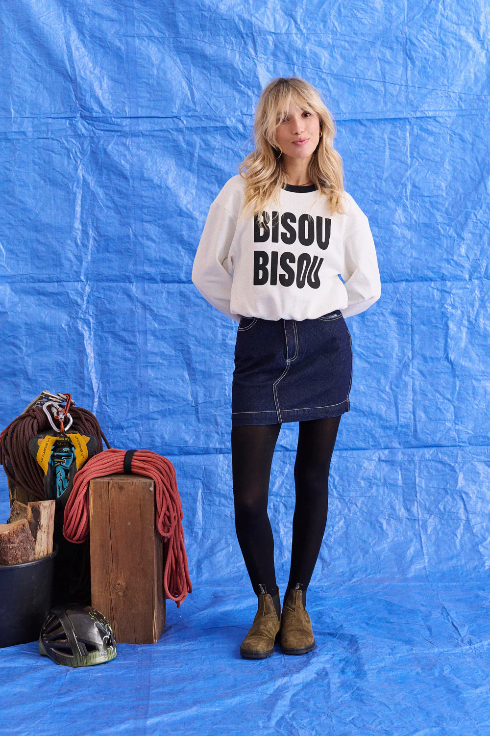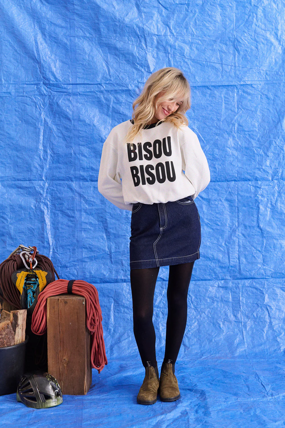 Een sweatshirt waar je vrolijk van wordt.De iets lossere, rechte snit, de contrasterende kraag en vooral de Bisou Bisou-print: makkelijk aan te trekken, makkelijk om van te houden. De elastische zoom accentueert het silhouet lichtjes, voor een coole pasvorm zonder dat je iets hoeft te verstellen.