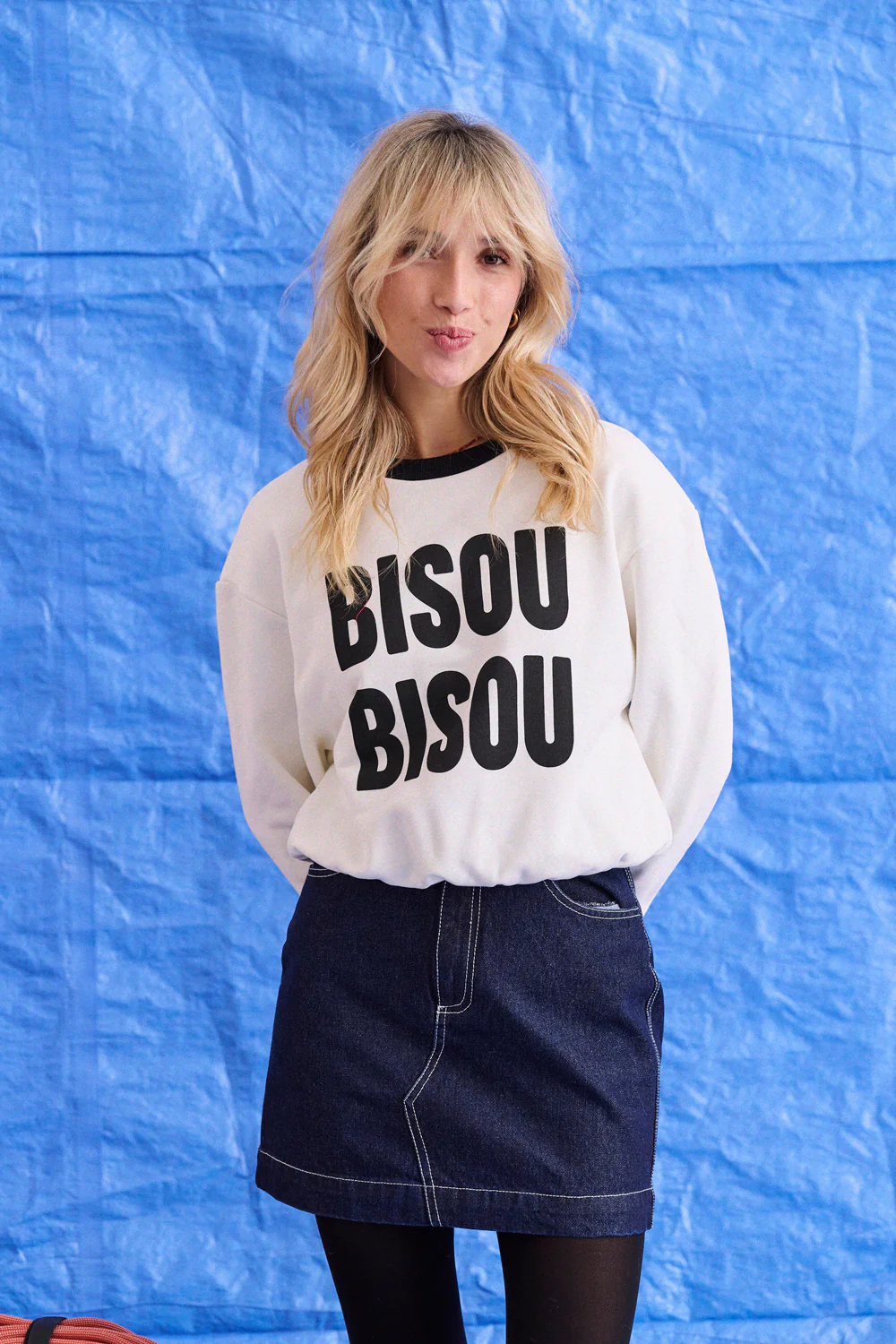 • Sweatshirt met 'Bisou Bisou'-print• Ronde halslijn met contrasterende bies• Hangende schouders• Elastisch aan de basis voor een blouse-effect