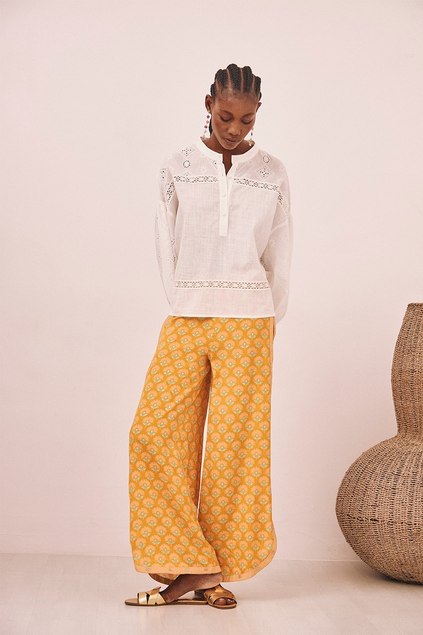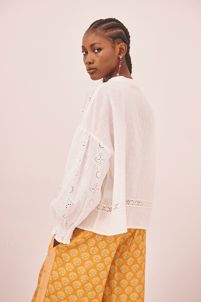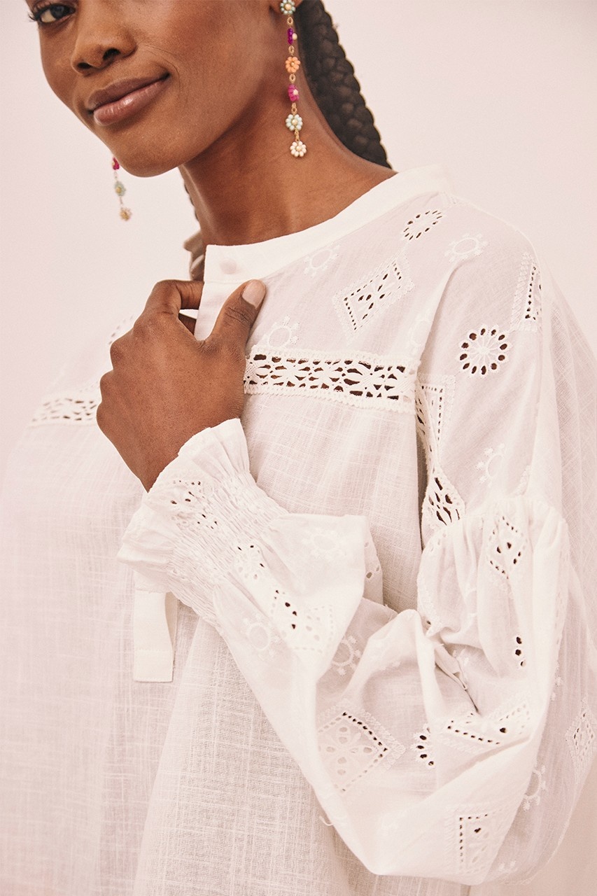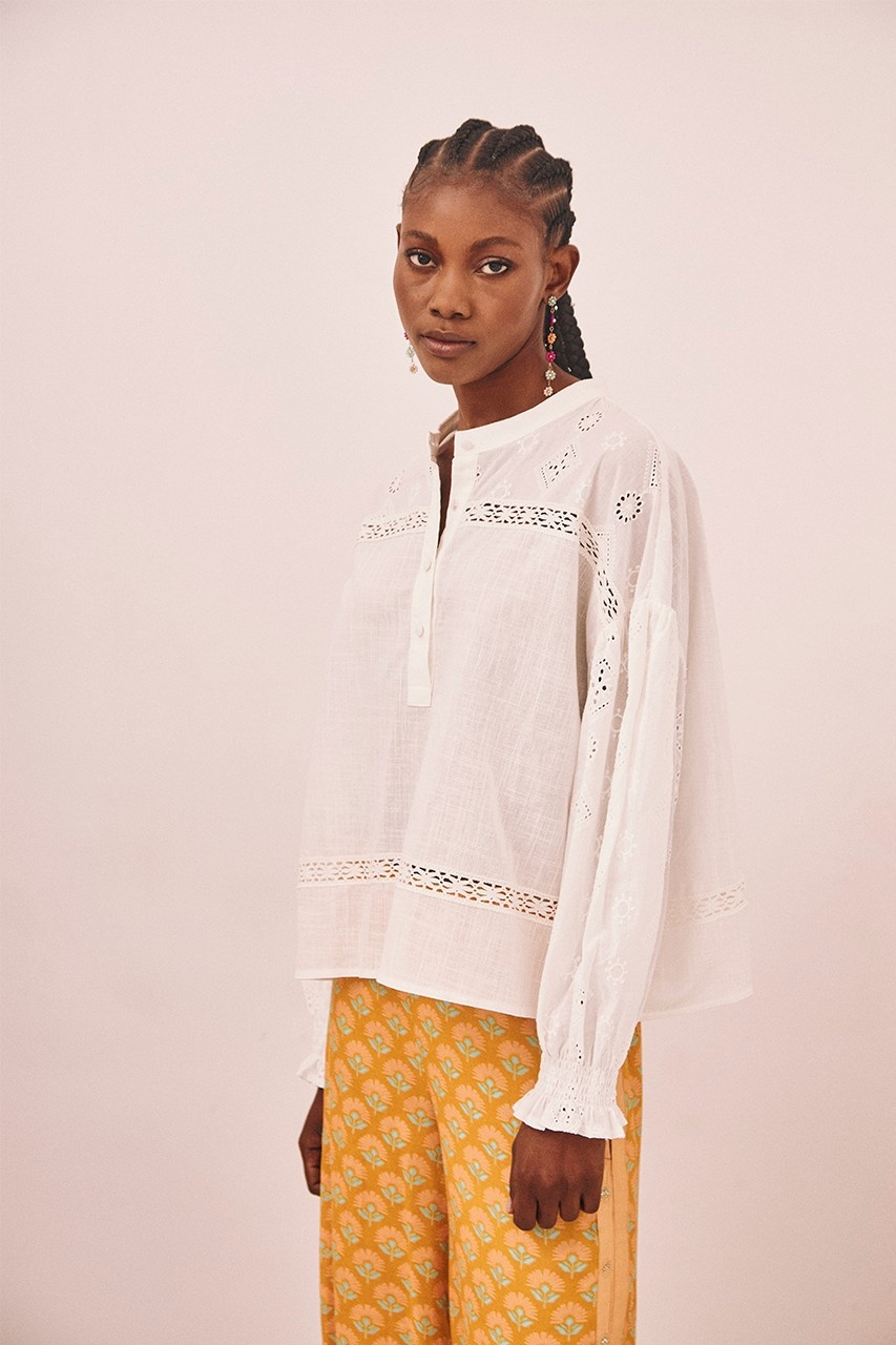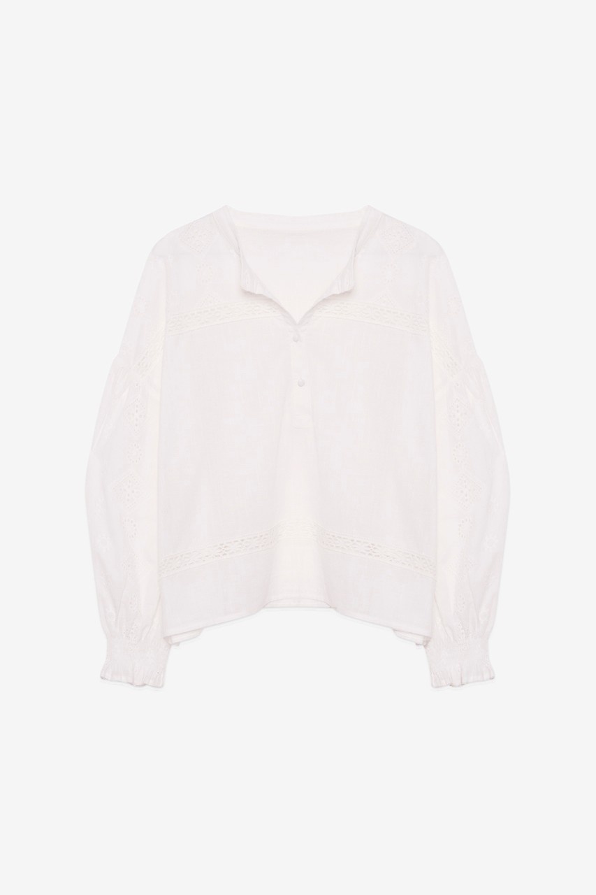 Lange katoenen blouse in een effen kleur tot op de heupen met lange mouwen. Opening aan de voorkant met knopen. Elastische manchetten met smokwerk. Kanten banddetail op de mouwen en het kledingstuk.