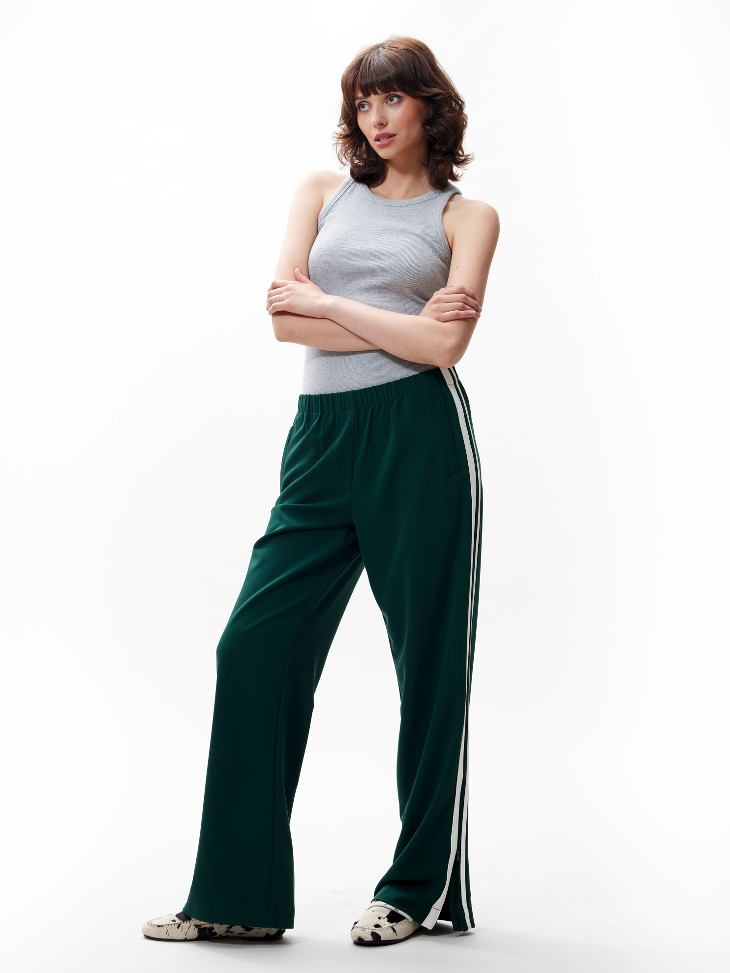 • Iconic! De sporty tape broek! Uitgevoerd in een medium-hoge taille, een wide leg fit, een stretch stof en een elastieken tailleband